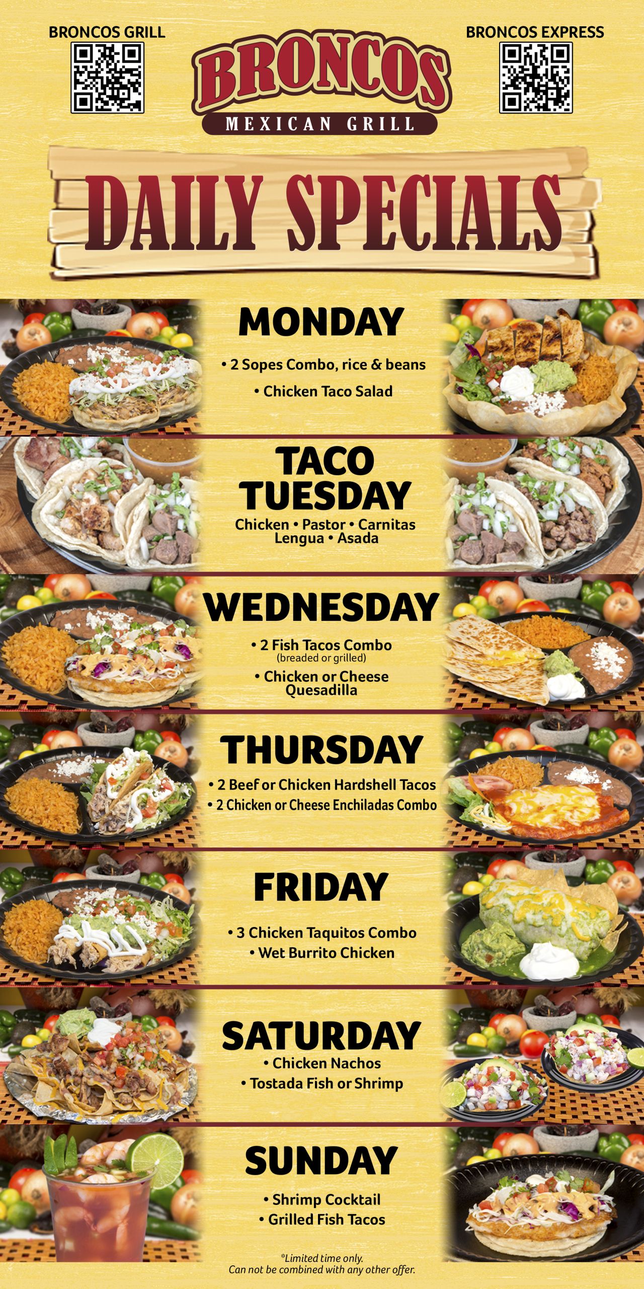 ¡Bienvenidos! Dive into the authentic flavors of Mexico with our irresistible daily specials, crafted to bring you a taste of tradition and a touch of innovation.